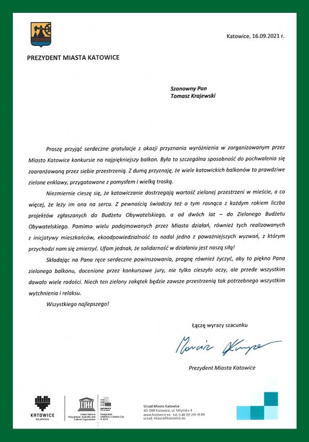 Na zdjęciach wyjątkowy projekt systemu hydroponicznego na balkonie prywatnym w Nikiszowcu, za który otrzymaliśmy w 2021 roku wyróżnienie w corocznym konkursie na najpiękniejszy balkon zorganizowanym przez Miasto Katowice.